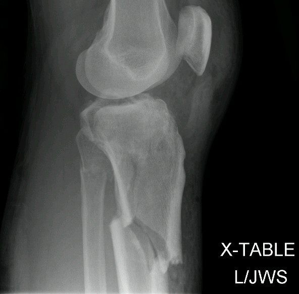 That's the external fixator they used to stabilize my knee before surgery (the swelling took 4 days to go down before they could do surgery). In case you're wondering, it's bolted into the bones in my thigh and lower leg.